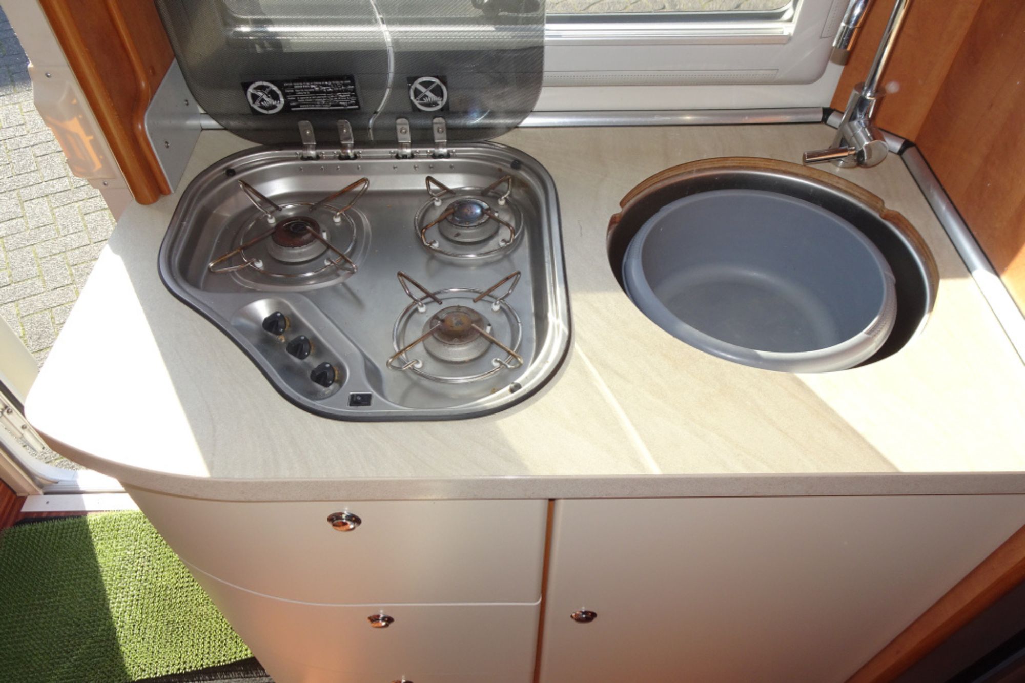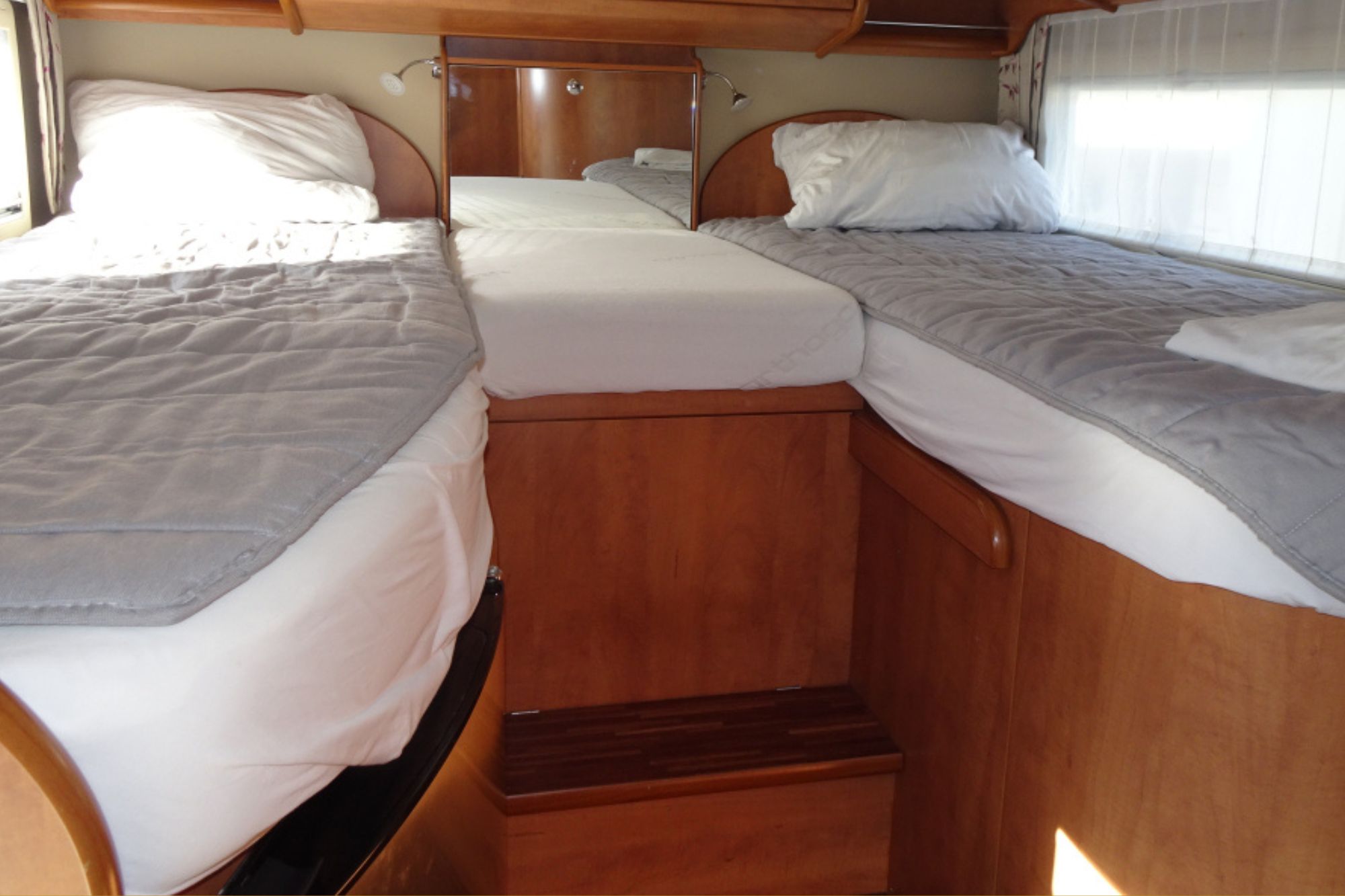 La cocina está completamente equipada con nevera con congelador, cocina de gas de tres fuegos y fregadero con agua caliente y fría. El baño es completo, con inodoro, lavabo y ducha independiente totalmente cerrada. En la parte trasera dispone de dos camas individuales que pueden unirse para formar una cama doble de gran tamaño, además de un garaje XXL con capacidad para equipaje voluminoso o bicicletas y con un toldo Thule.
