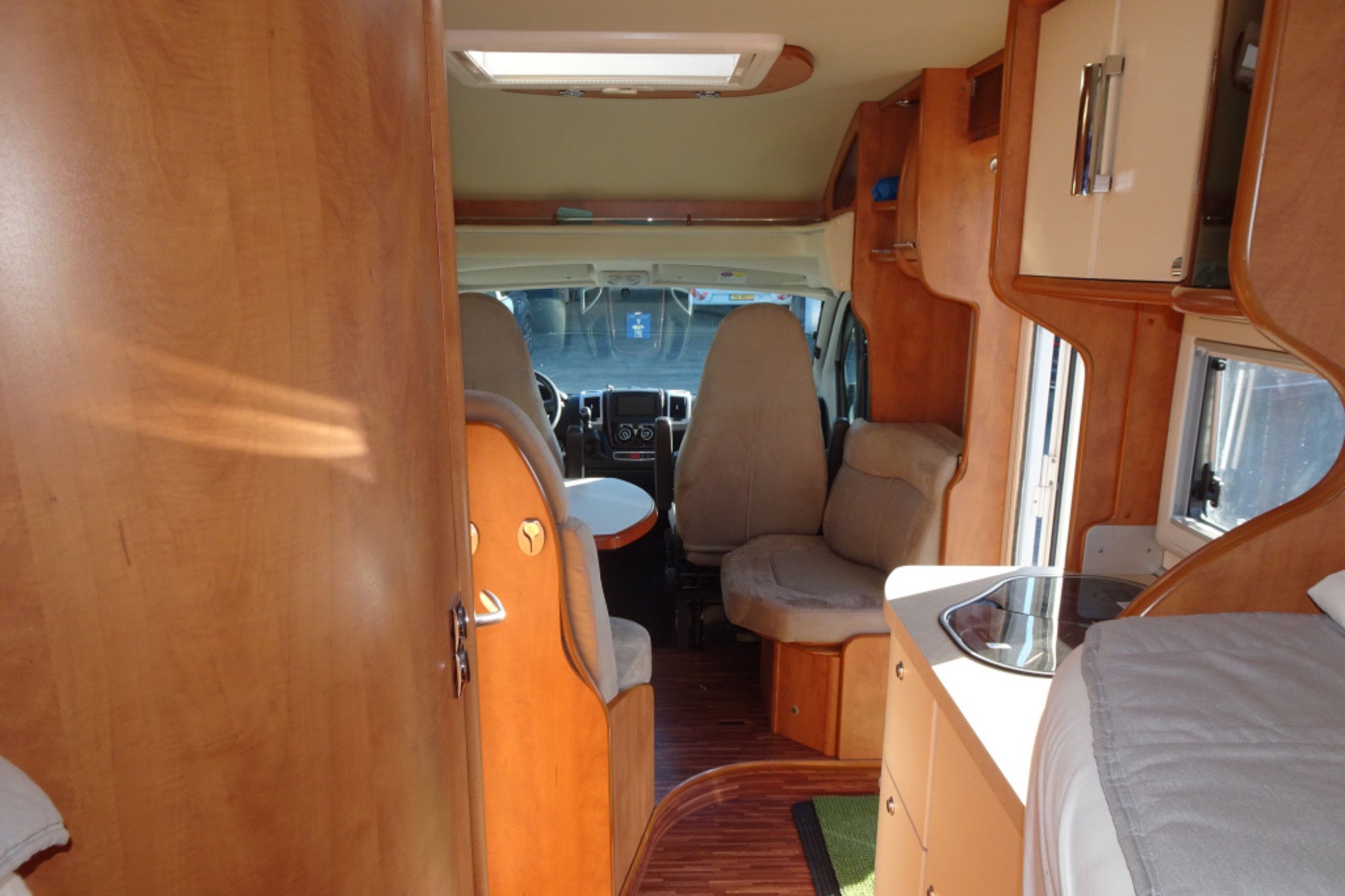 Está equipada con motor Fiat 2.3 L de 150 CV y llantas de 16″, que ofrece una conducción fiable y eficiente, ideal tanto para largos viajes como para escapadas. El interior presenta una cuidada distribución con una amplia y luminosa zona de estar, compuesta por asientos delanteros giratorios, salón en L con banco lateral y tapicería de alta calidad, creando un espacio acogedor desde el que disfrutar de la televisión con antena parabólica y del gran techo panorámico que aporta una excelente entrada de luz natural.
