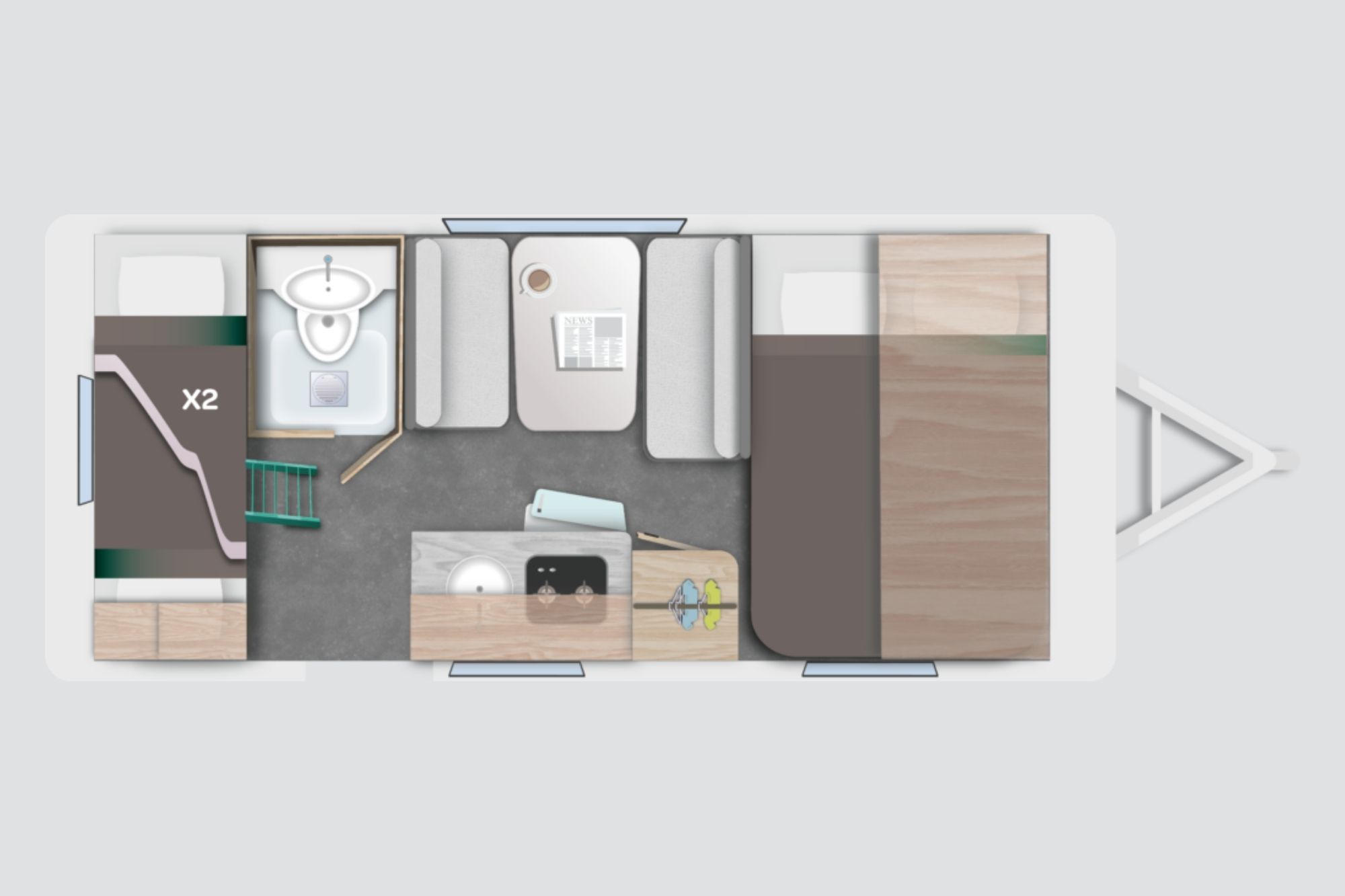 Con sus dos literas, la amplia cama fija en la parte delantera y una dinette convertible, la 470PE se presenta como una auténtica solución para la familia. Su distribución inteligente y su equipamiento completo permiten viajar con varias personas, ofreciendo al mismo tiempo un espacio de vida cómodo y funcional en el día a día.