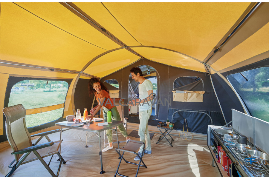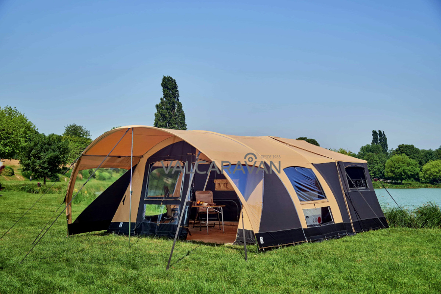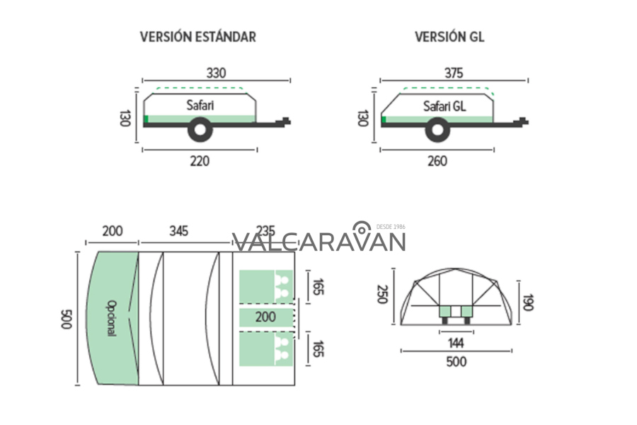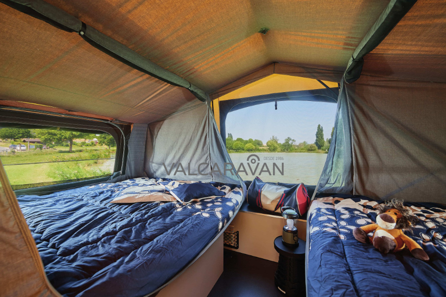 Remolque convertible a tienda de campaña RACLET SAFARI. Sobre pedido. Máxima capacidad en carro tienda para acampada.   Cama doble de 130×200 cm con somier de láminas, más avance incorporado, de montaje ultra rápido sin piquetas. Oscurecedores y mosquiteras en todas las zonas. Arcones interiores. Patas de apoyo reforzadas. Gran mueble cocina con fogones y fregadero (en versión GL) Sin matrícula roja (MMA 750 kg). Ligero para CUALQUIER COCHE. Con amortiguadores, máxima estabilidad. Pídanos financiación con sólo su nómina.