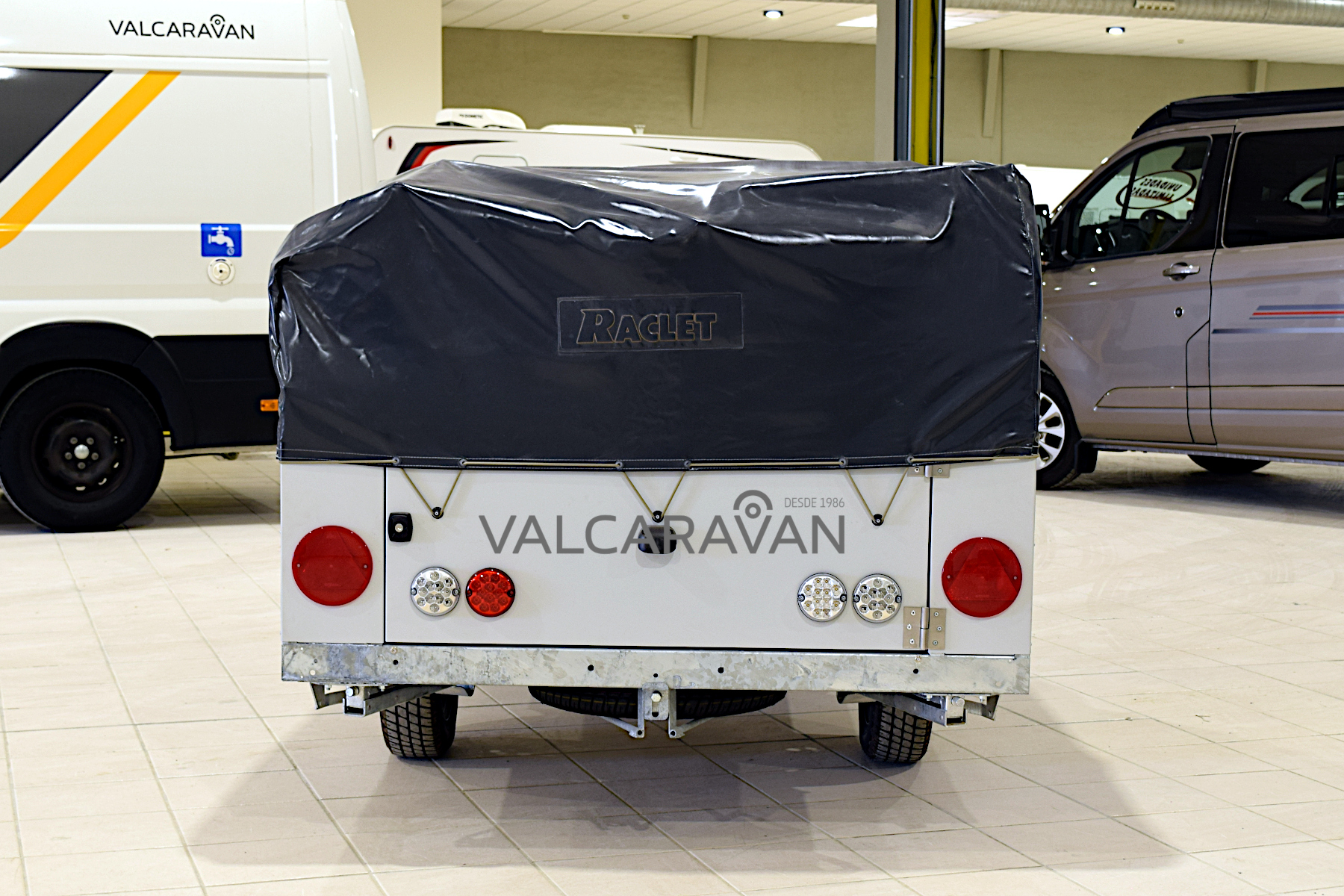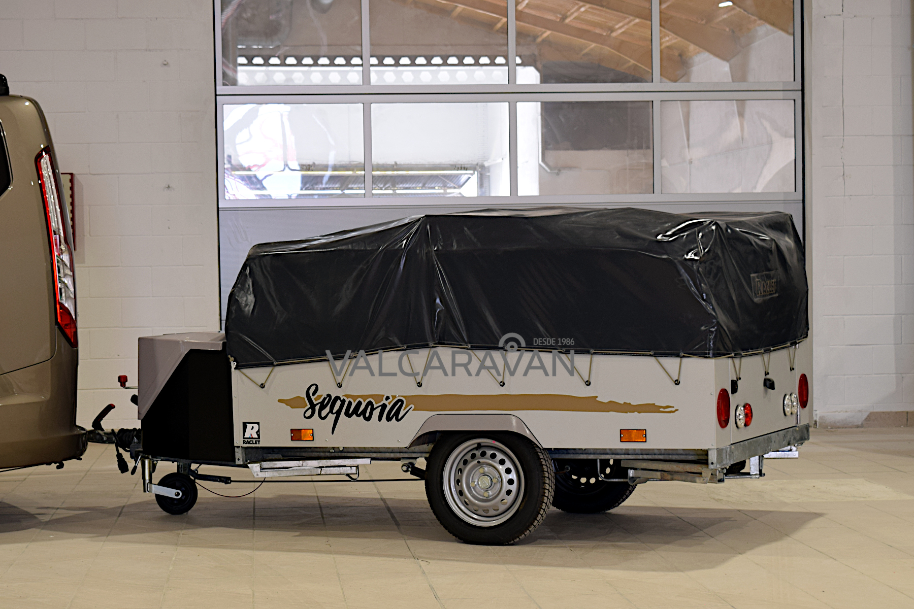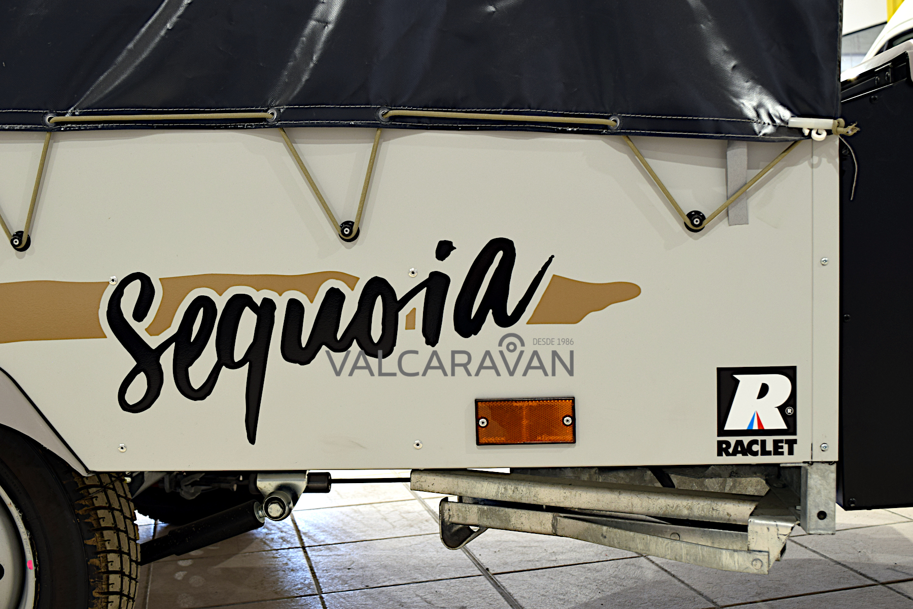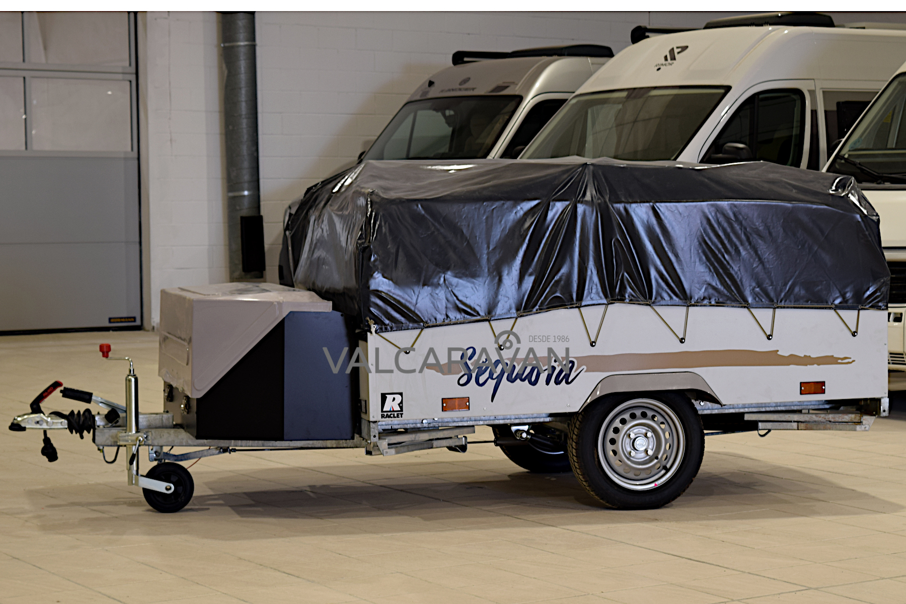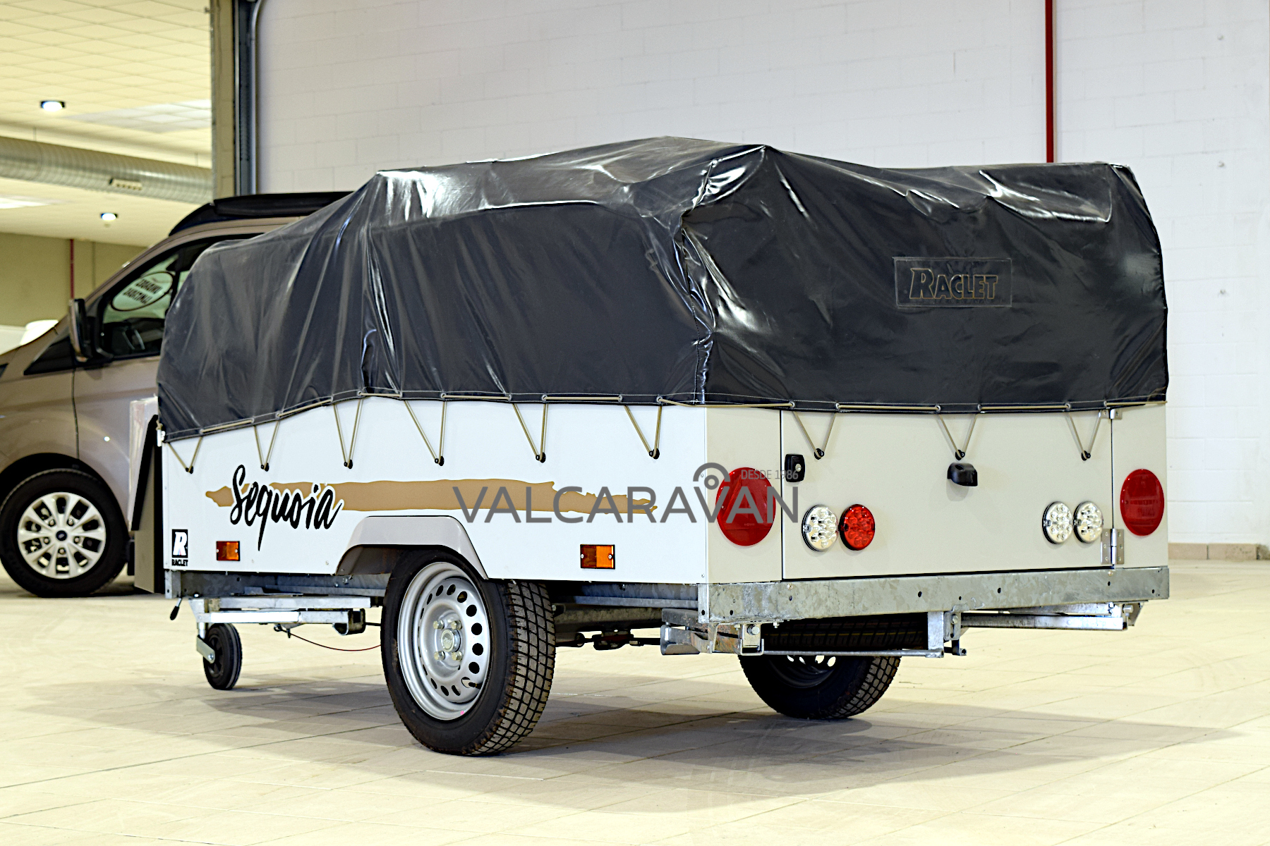 Remolque convertible a tienda de campaña RACLET SEQUOIA. En stock. Máxima gama en carro tienda para acampada.   Dos camas dobles con somier de láminas de 165×210 cm y colchones de calidad, más comedor central con bancadas con asientos en polipiel. Oscurecedores y mosquiteras en todas las zonas. Arcones interiores. Posibilidad de hasta 8 plazas, de avance hinchable, toldo y anexo, de baca y gran arcón, de mueble cocina (versión con cocina)… ¡Configúralo a tu gusto! Hasta 40 metros cuadrados en total. Arcones interiores. Patas de apoyo reforzadas. Varios montajes posibles: vivienda de uso rápido, o vivienda más más avance, o vivienda más avance y anexo lateral… Un montaje para cada ocasión. Opcionales: -Avance completo. -Avance completo hinchable. -Habitación inferior para plaza extra. -Faldones remolque. -Bloque de tomas 220V y USB. -Cofre delantero 300L. -Anexo lateral. -baca portaobjetos. -Rueda de repuesto con soporte. -Suelo estanco avance. -Frenos de inercia y de mano.